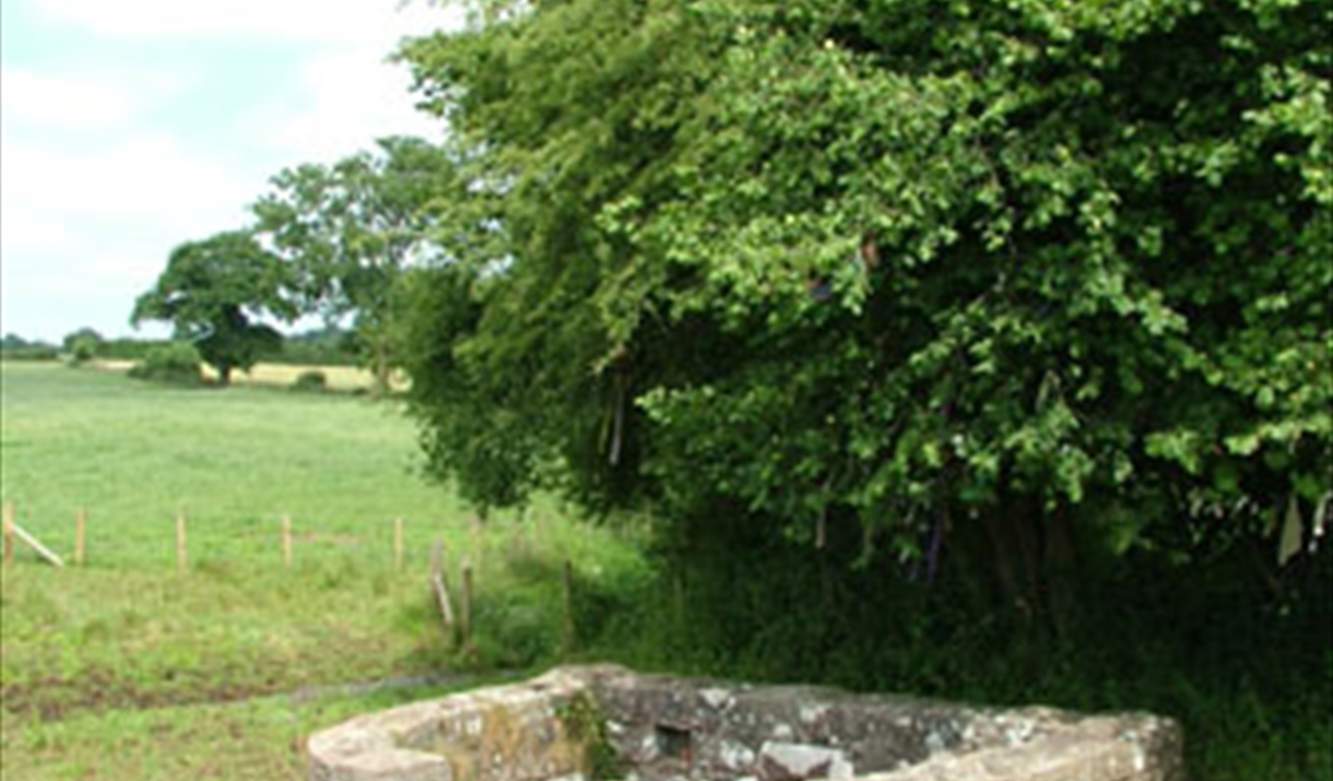 A Chalybeate spring bubbles up into a stone basin set into an arched recess in the rearstone wall of a horse-shoe shaped structure partly sunken into the meadow. Steps lead down into a paved area with a stone benched seat on either side, although in recent years a rise in floor level has made sitting in here difficult. There are two squared niches in the rear wall, possibly for drinking vessels or votive offerings. Today offerings are also frequently placed on the ledge around the inside of the arched recess, while the hedgerow trees behind the well are festooned with strips of white cloth and ribbons, reflecting a continuing belief in the medicinal properties of the spring water. Tradition had it that if you dipped a piece of your garment in the healing water, as the fabric rotted away, so your symptoms would disappear.